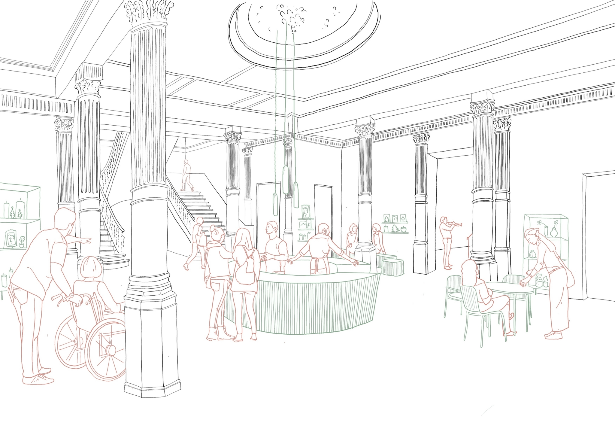 De erfgoedcontext en beschermde statuut maken dit project uniek. We passen principes van inclusief en universal design toe om integrale toegankelijkheid te verzekeren. Nieuwe hellingsbanen aan de noordoost- en zuidwestzijde leiden respectievelijke naar de gelijkvloerse en kelderverdieping. Twee nieuwe traphallen en een lift op strategische, erfgoedverantwoorde locaties en brandveilige en logische circulatie.